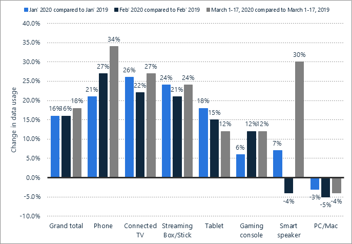 Figure: Year-over-year change in average monthly in-home data usage by device in the United States from January to March 2020, Source(s): comScore; ID 1106821
